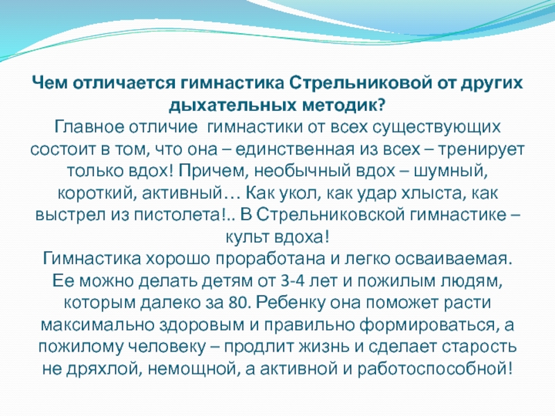 Слайд 6Чем отличается гимнастика Стрельниковой от других дыхательных методик?