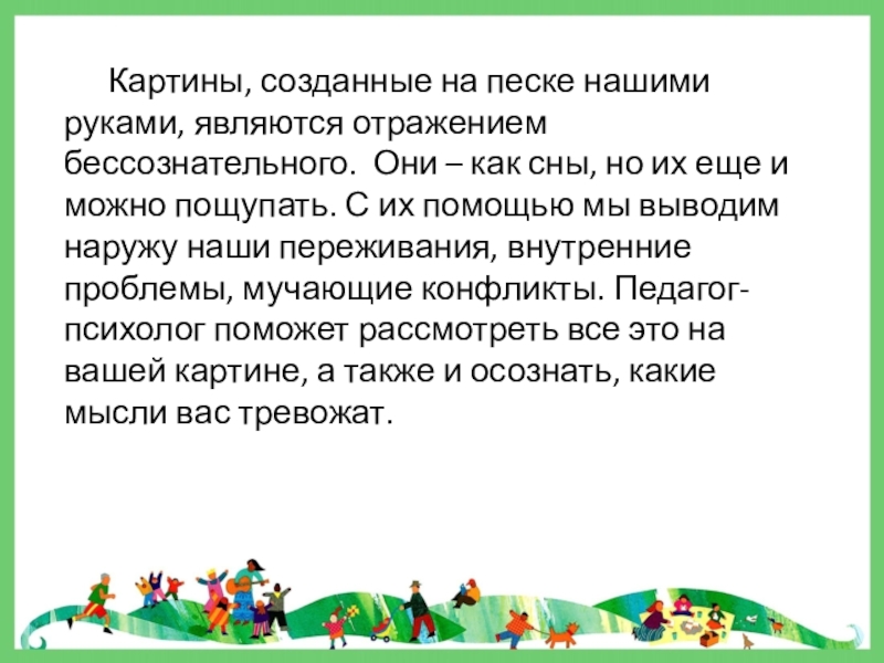 Слайд 5 Картины, созданные на песке нашими руками, являются отражением бессознательного. Они –