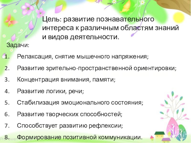 Слайд 7Цель: развитие познавательного интереса к различным областям знаний и видов деятельности.