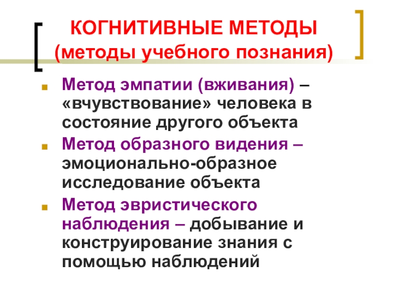 КОГНИТИВНЫЕ МЕТОДЫ (методы учебного познания)Метод эмпатии (вживания) – «вчувствование» человека в состояние другого объектаМетод образного видения –