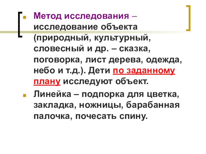 Метод исследования – исследование объекта (природный, культурный, словесный и др. – сказка, поговорка, лист дерева, одежда, небо