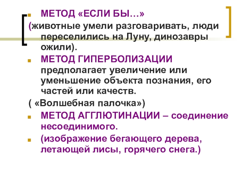 МЕТОД «ЕСЛИ БЫ…»(животные умели разговаривать, люди переселились на Луну, динозавры ожили).МЕТОД ГИПЕРБОЛИЗАЦИИ предполагает увеличение или уменьшение объекта