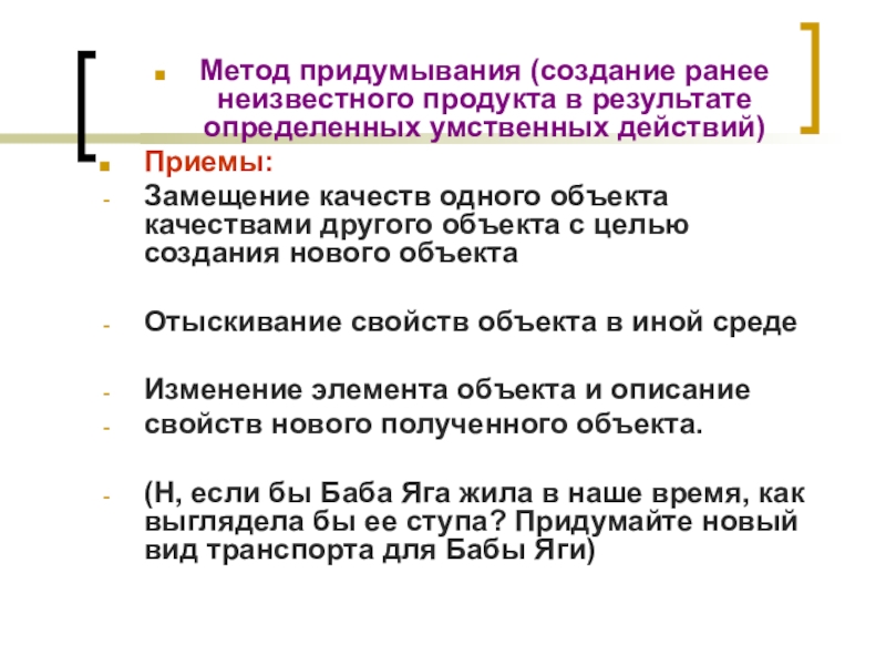 Метод придумывания (создание ранее неизвестного продукта в результате определенных умственных действий)Приемы: Замещение качеств одного объекта качествами другого