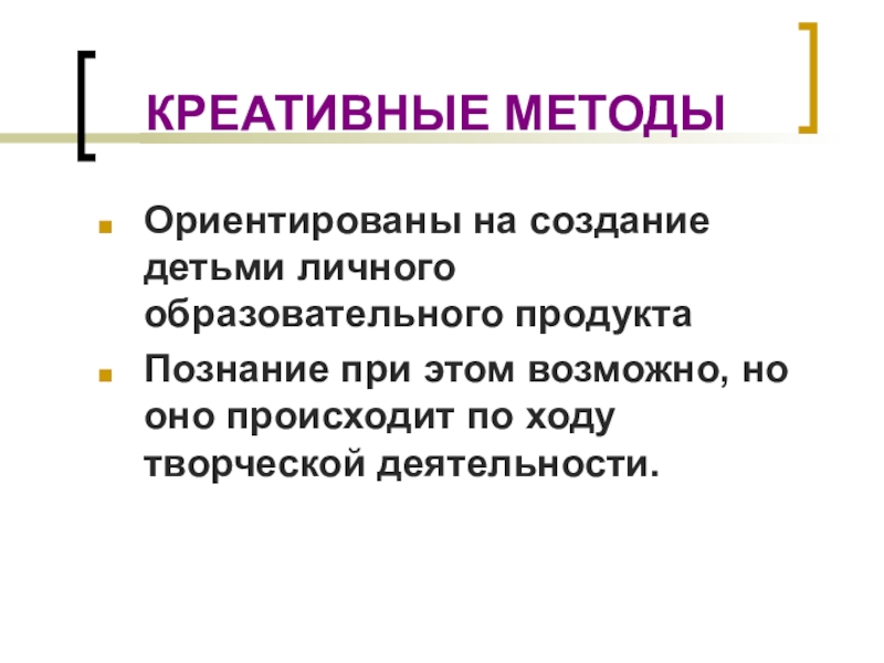 КРЕАТИВНЫЕ МЕТОДЫОриентированы на создание детьми личного образовательного продуктаПознание при этом возможно, но оно происходит по ходу творческой
