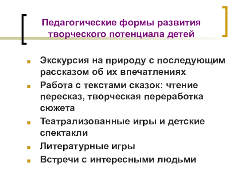 Педагогические формы развития творческого потенциала детейЭкскурсия на природу с последующим рассказом об их впечатлениях Работа с текстами