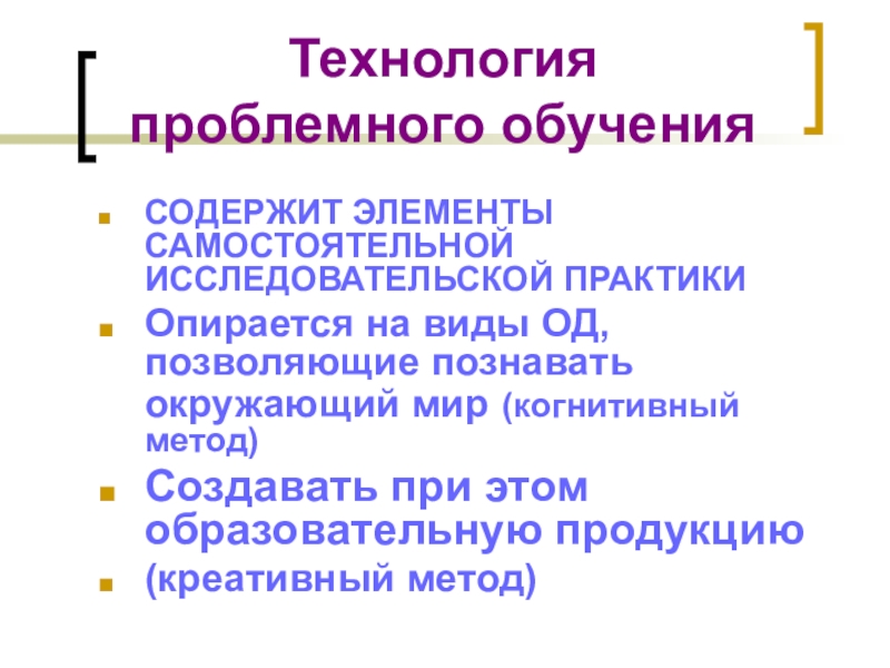 Технология проблемного обученияСОДЕРЖИТ ЭЛЕМЕНТЫ САМОСТОЯТЕЛЬНОЙ ИССЛЕДОВАТЕЛЬСКОЙ ПРАКТИКИОпирается на виды ОД, позволяющие познавать окружающий мир (когнитивный метод)Создавать при