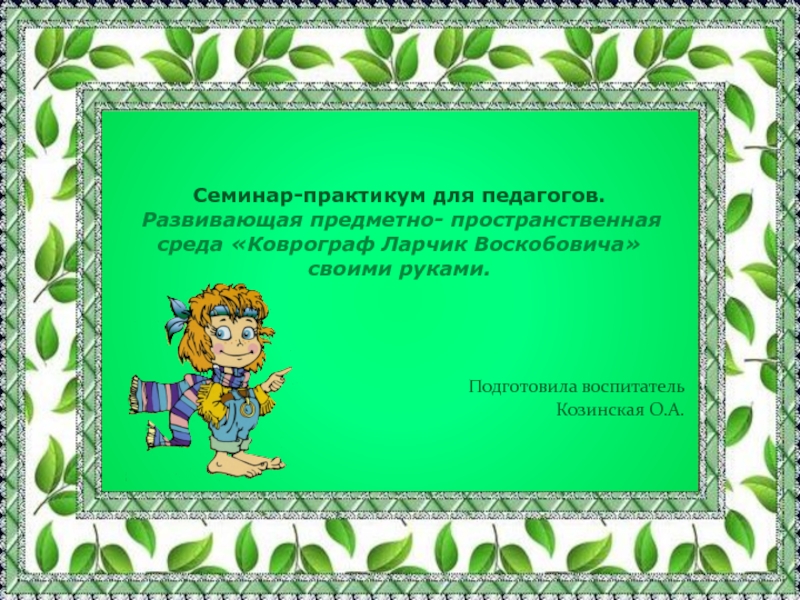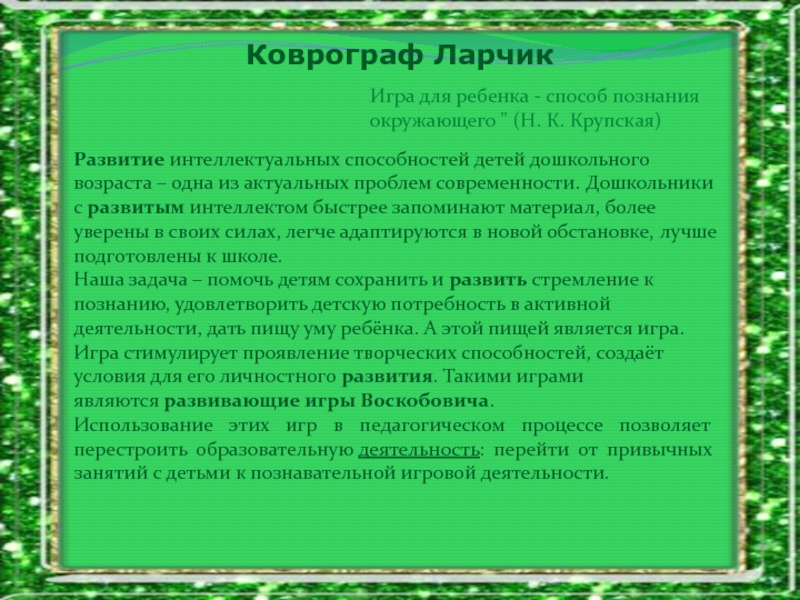 Игра стимулирует проявление творческих способностей, создаёт условия для его личностного развития. Такими играми являются развивающие игры Воскобовича.
