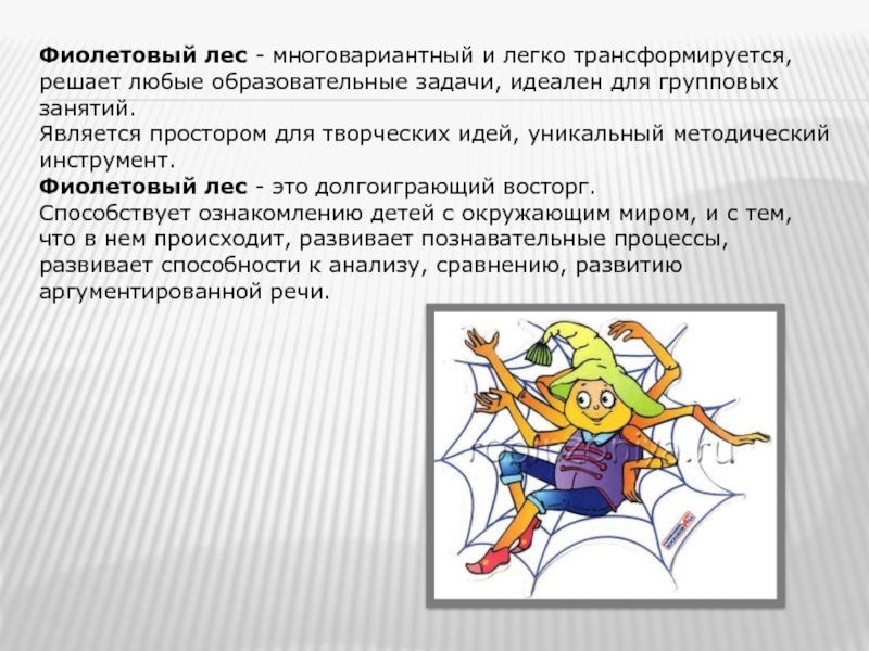 Слайд 5Фиолетовый лес - многовариантный и легко трансформируется, решает любые образовательные задачи, идеален для