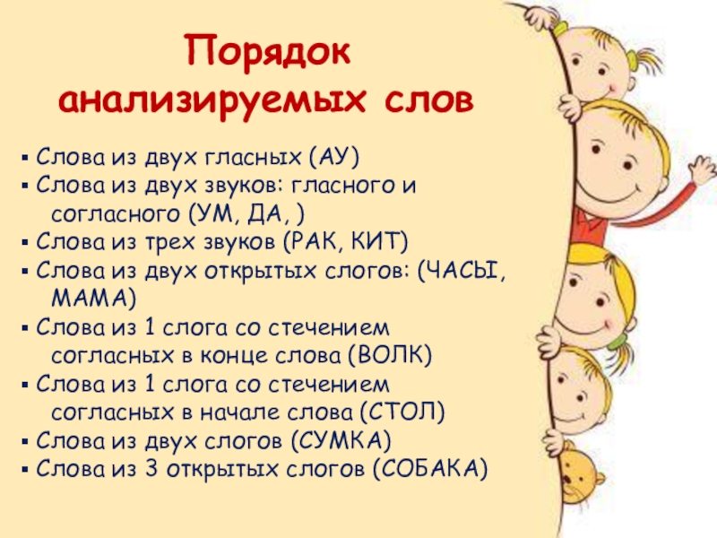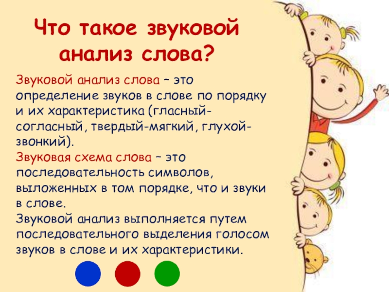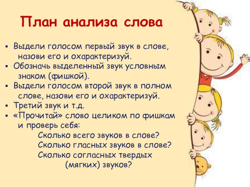 Звуковой анализ выполняется путем последовательного выделения голосом звуков в слове и их характеристики.