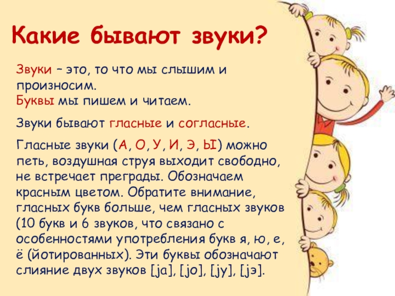Гласные звуки (А, О, У, И, Э, Ы) можно петь, воздушная струя выходит свободно, не встречает преграды. Обозначаем красным цветом. Обратите внимание, гласных букв больше, чем гласных звуков (10 букв и 6 звуков, что связано с особенностями употребления букв я, ю, е, ё (йотированных). Эти буквы обозначают слияние двух звуков [jа], [jо], [jу], [jэ].