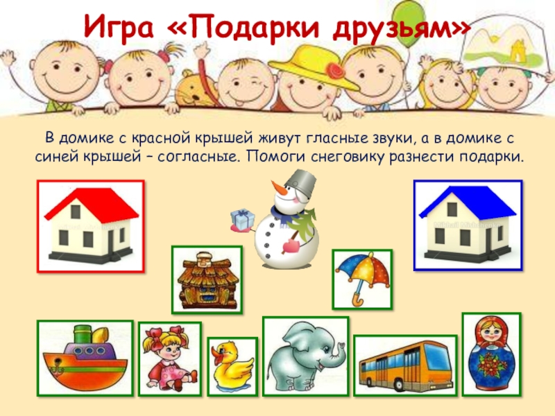 в домике с синей крышей – согласные. Помоги снеговику разнести подарки.