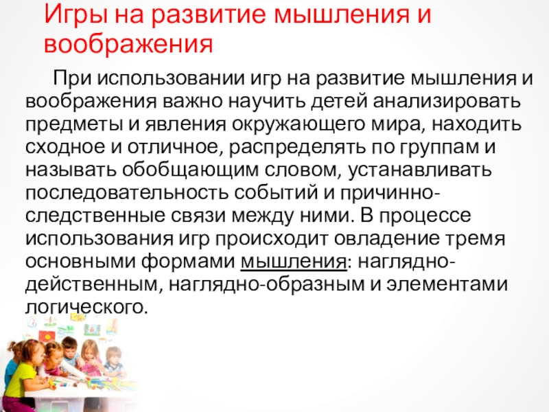 научить детей анализировать предметы и явления окружающего мира, находить сходное и отличное, распределять по группам и называть обобщающим словом, устанавливать последовательность событий и причинно-следственные связи между ними. В процессе использования игр происходит овладение тремя основными формами мышления: наглядно-действенным, наглядно-образным и элементами логического.