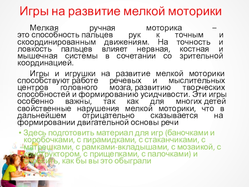 Игры и игрушки на развитие мелкой моторики способствуют работе речевых и мыслительных центров головного мозга, развитию творческих способностей и формированию усидчивости. Эти игры особенно важны, так как для многих детей свойственные нарушения мелкой моторики, что в дальнейшем отрицательно сказывается на формировании двигательной основы речи