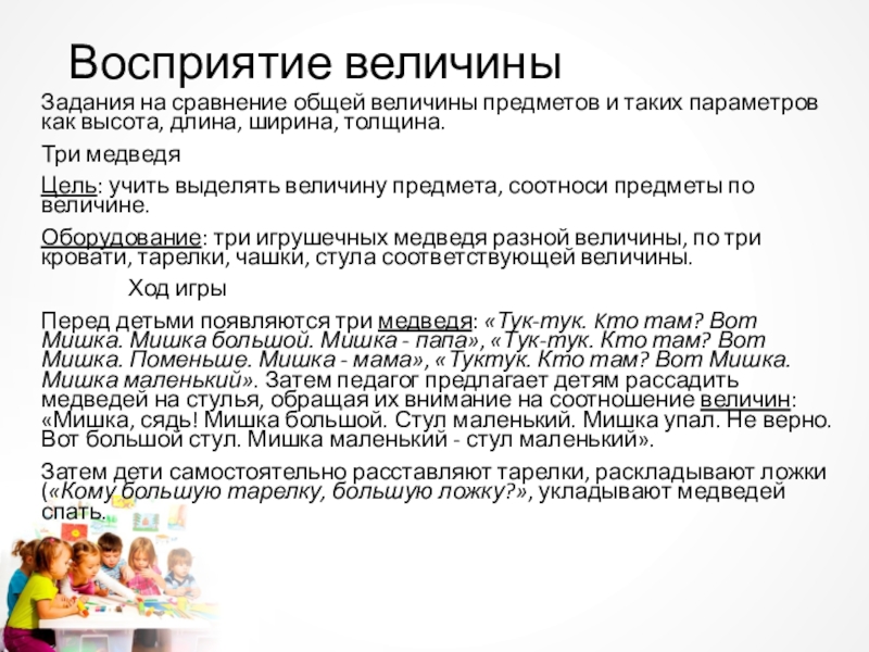 Перед детьми появляются три медведя: «Тук-тук. Kто там? Вот Мишка. Мишка большой. Мишка - папа», «Тук-тук. Кто там? Вот Мишка. Поменьше. Мишка - мама», «Туктук. Кто там? Вот Мишка. Мишка маленький». Затем педагог предлагает детям рассадить медведей на стулья, обращая их внимание на соотношение величин: «Мишка, сядь! Мишка большой. Стул маленький. Мишка упал. Не верно. Вот большой стул. Мишка маленький - стул маленький».