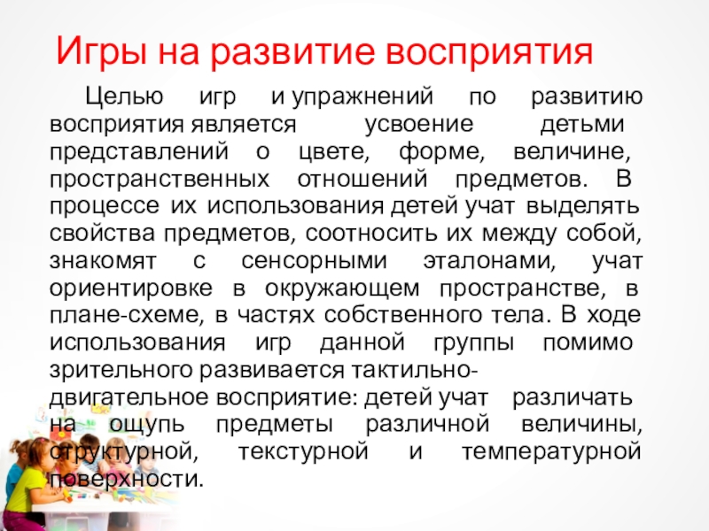 представлений о цвете, форме, величине, пространственных отношений предметов. В процессе их использования детей учат выделять свойства предметов, соотносить их между собой, знакомят с сенсорными эталонами, учат ориентировке в окружающем пространстве, в плане-схеме, в частях собственного тела. В ходе использования игр данной группы помимо зрительного развивается тактильно-двигательное восприятие: детей учат различать на ощупь предметы различной величины, структурной, текстурной и температурной поверхности.