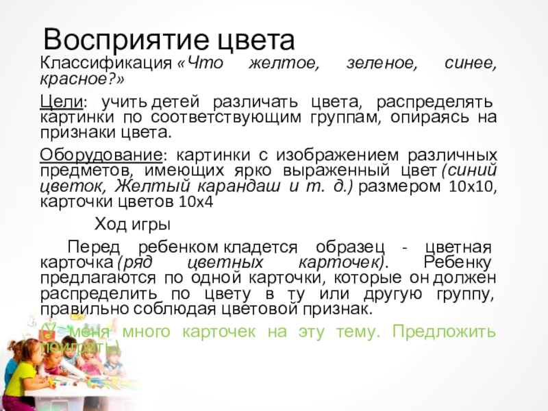 Перед ребенком кладется образец - цветная карточка (ряд цветных карточек). Ребенку предлагаются по одной карточки, которые он должен распределить по цвету в ту или другую группу, правильно соблюдая цветовой признак.