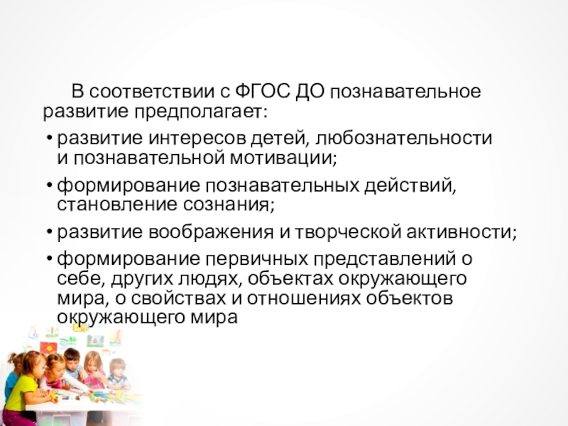 Слайд 4 В соответствии с ФГОС ДО познавательное развитие предполагает: