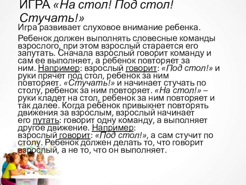 Слайд 13ИГРА «На стол! Под стол! Стучать!»
