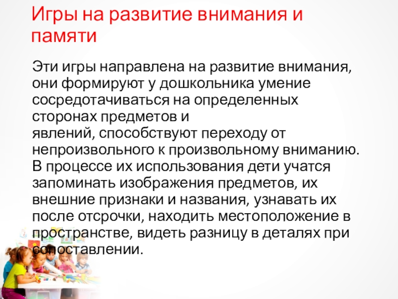 формируют у дошкольника умение сосредотачиваться на определенных сторонах предметов и явлений, способствуют переходу от непроизвольного к произвольному вниманию. В процессе их использования дети учатся запоминать изображения предметов, их внешние признаки и названия, узнавать их после отсрочки, находить местоположение в пространстве, видеть разницу в деталях при сопоставлении.