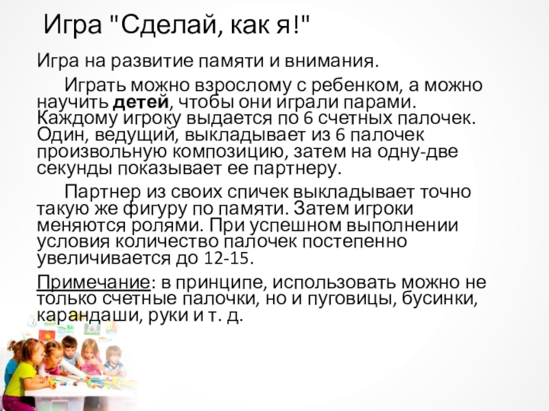 Партнер из своих спичек выкладывает точно такую же фигуру по памяти. Затем игроки меняются ролями. При успешном выполнении условия количество палочек постепенно увеличивается до 12-15.