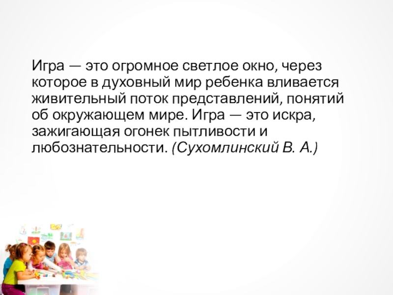ребенка вливается живительный поток представлений, понятий об окружающем мире. Игра — это искра, зажигающая огонек пытливости и любознательности. (Сухомлинский В. А.)