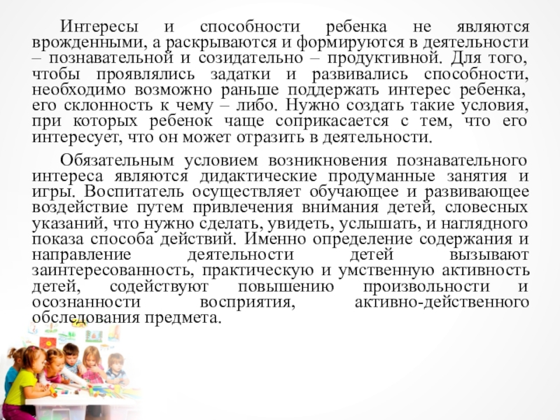 Слайд 19 Интересы и способности ребенка не являются врожденными, а раскрываются и формируются