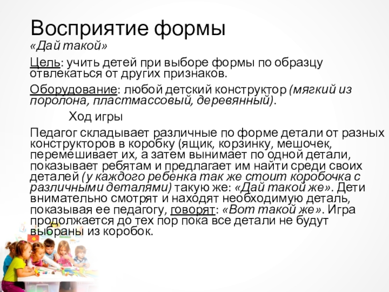 Цель: учить детей при выборе формы по образцу отвлекаться от других