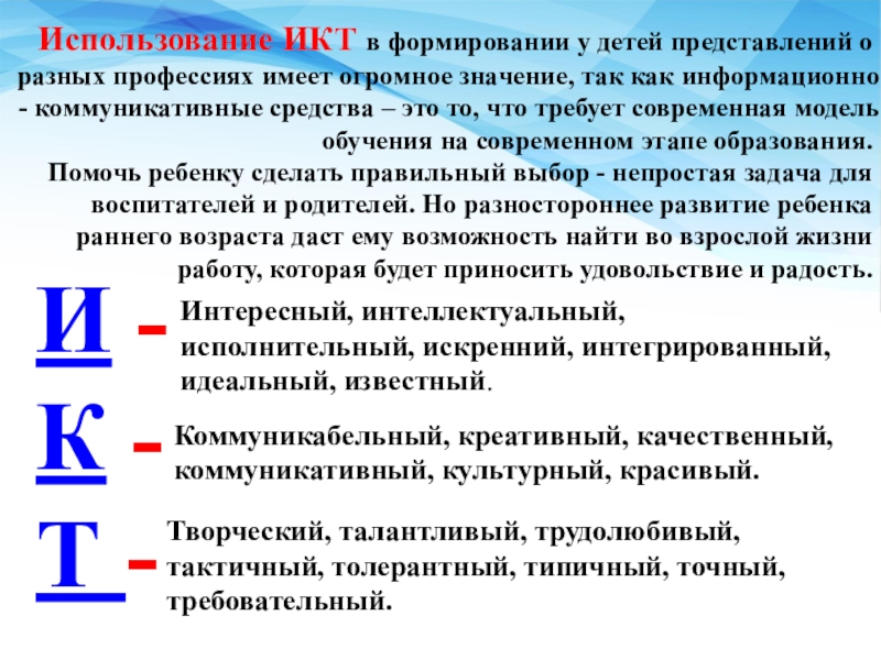 Творческий, талантливый, трудолюбивый, тактичный, толерантный, типичный, точный, требовательный.