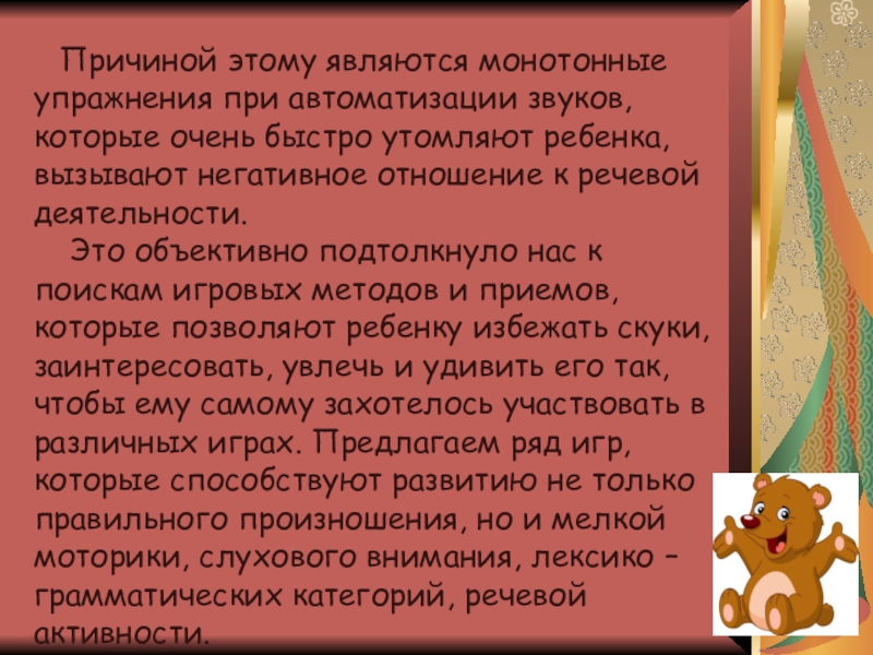 Слайд 4 Причиной этому являются монотонные упражнения при автоматизации звуков, которые