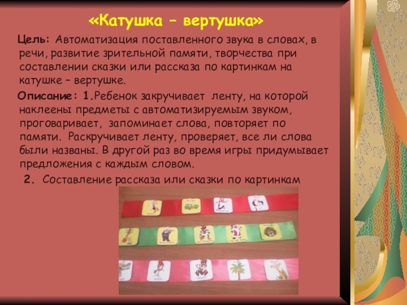 Описание: 1.Ребенок закручивает ленту, на которой наклеены предметы с автоматизируемым звуком, проговаривает, запоминает слова, повторяет по памяти. Раскручивает ленту, проверяет, все ли слова были названы. В другой раз во время игры придумывает предложения с каждым словом.