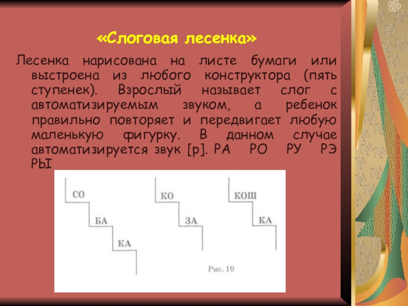 конструктора (пять ступенек). Взрослый называет слог с автоматизируемым звуком, а ребенок правильно повторяет и передвигает любую маленькую фигурку. В данном случае автоматизируется звук [р]. РА РО РУ РЭ РЫ