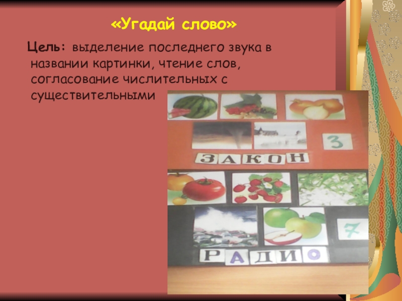Описание: На столе картинки с изображением овощей и фруктов, плоскостные дерево и грядка. Ребёнок должен сначала «собрать» овощи и фрукты с одним заданным звуком, а затем с другим звуком. Например, на звук Р – морковь, картошка, помидор, горох, кукуруза, груша, виноград, хурма, персик.