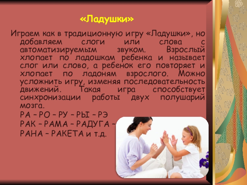 с автоматизируемым звуком. Взрослый хлопает по ладошкам ребенка и называет слог или слово, а ребенок его повторяет и хлопает по ладоням взрослого. Можно усложнить игру, изменяя последовательность движений. Такая игра способствует синхронизации работы двух полушарий мозга.