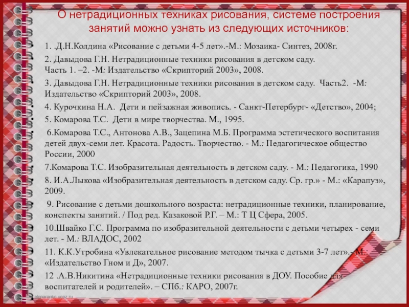 12 .А.В.Никитина «Нетрадиционные техники рисования в ДОУ. Пособие для воспитателей и родителей». – СПб.: КАРО, 2007г.