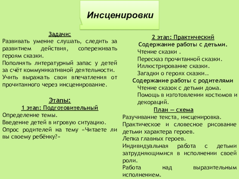 Разучивание текста, инсценировка.