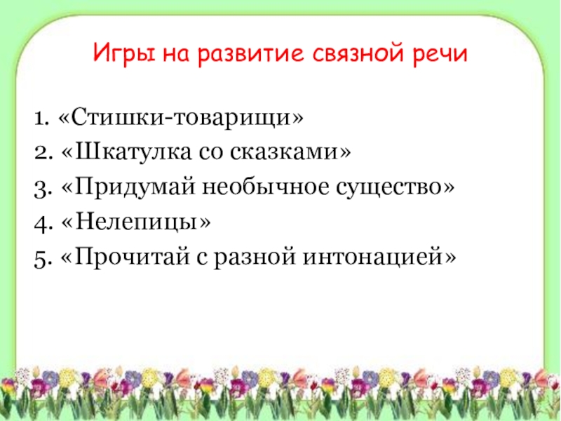 Игры на развитие связной речи1. «Стишки-товарищи»2. «Шкатулка со сказками»3. «Придумай необычное существо»4. «Нелепицы»5. «Прочитай с разной интонацией»