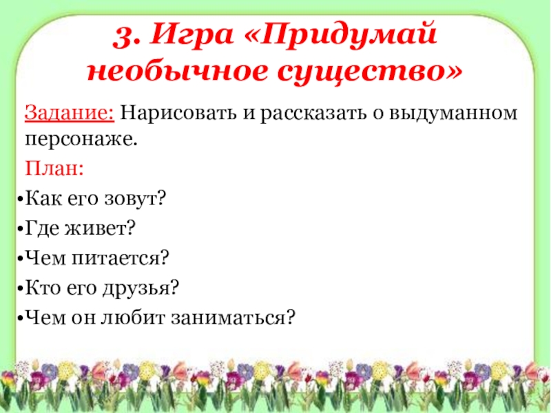 3. Игра «Придумай необычное существо»Задание: Нарисовать и рассказать о выдуманном персонаже.План:Как его зовут?Где живет?Чем питается?Кто его друзья?Чем