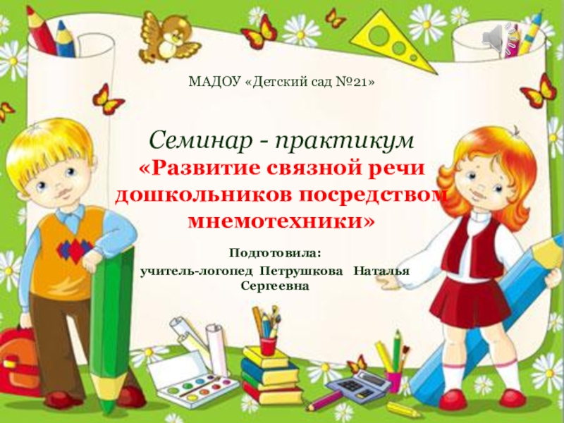 МАДОУ «Детский сад №21»   Семинар - практикум «Развитие связной речи дошкольников посредством мнемотехники»Подготовила: учитель-логопед Петрушкова