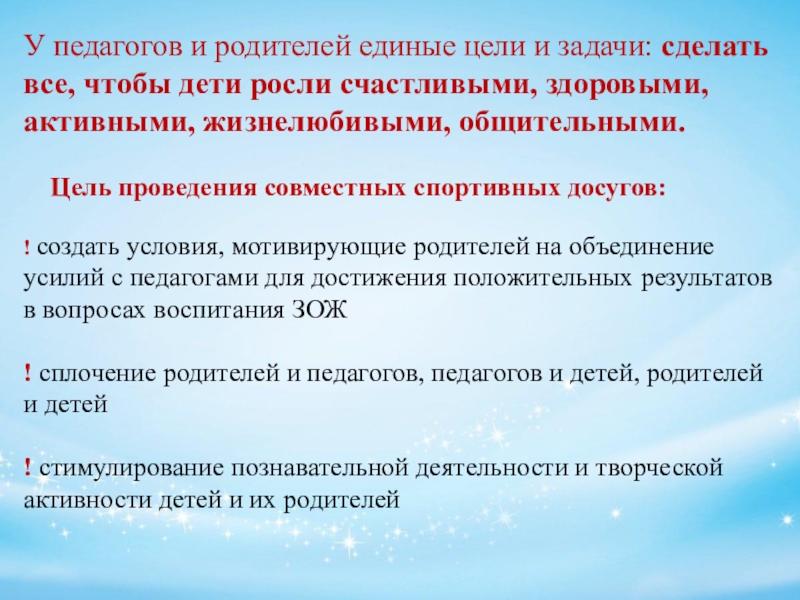 ! создать условия, мотивирующие родителей на объединение усилий с педагогами для достижения положительных результатов в вопросах воспитания ЗОЖ