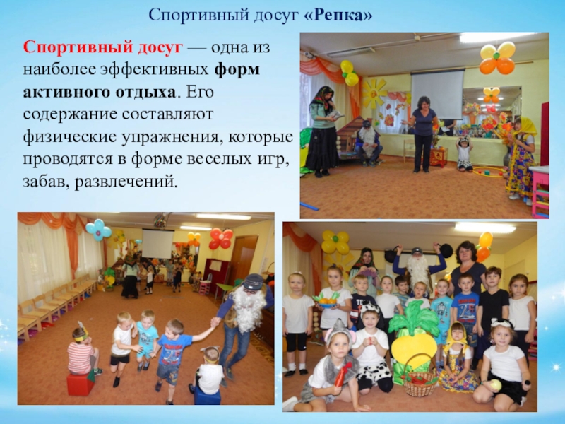 содержание составляют физические упражнения, которые проводятся в форме веселых игр, забав, развлечений.