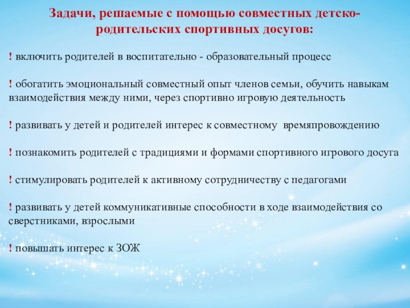 Слайд 3Задачи, решаемые с помощью совместных детско- родительских спортивных досугов: