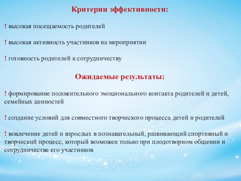 ! вовлечение детей и взрослых в познавательный, развивающий спортивный и творческий процесс, который возможен только при плодотворном общении и сотрудничестве его участников