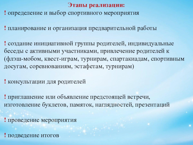 ! создание инициативной группы родителей, индивидуальные беседы с активными участниками, привлечение родителей к (флэш-мобом, квест-играм, турнирам, спартакиадам, спортивным досугам, соревнованиям, эстафетам, турнирам)