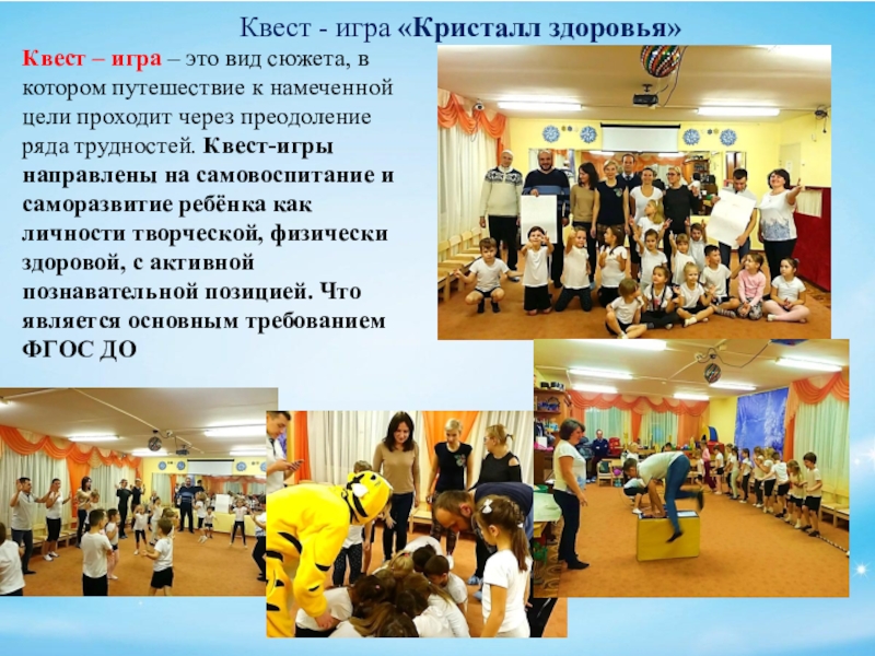 в котором путешествие к намеченной цели проходит через преодоление ряда трудностей. Квест-игры направлены на самовоспитание и саморазвитие ребёнка как личности творческой, физически здоровой, с активной познавательной позицией. Что является основным требованием ФГОС ДО