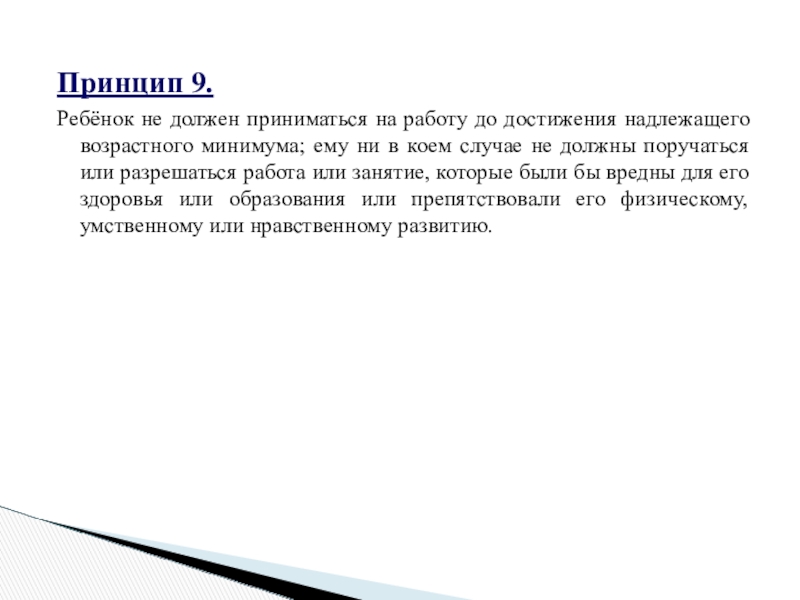 возрастного минимума; ему ни в коем случае не должны поручаться или разрешаться работа или занятие, которые были бы вредны для его здоровья или образования или препятствовали его физическому, умственному или нравственному развитию.