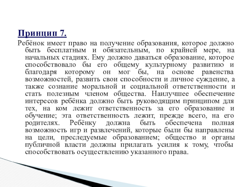 бесплатным и обязательным, по крайней мере, на начальных стадиях. Ему должно даваться образование, которое способствовало бы его общему культурному развитию и благодаря которому он мог бы, на основе равенства возможностей, развить свои способности и личное суждение, а также сознание моральной и социальной ответственности и стать полезным членом общества. Наилучшее обеспечение интересов ребёнка должно быть руководящим принципом для тех, на ком лежит ответственность за его образование и обучение; эта ответственность лежит, прежде всего, на его родителях. Ребёнку должна быть обеспечена полная возможность игр и развлечений, которые были бы направлены на цели, преследуемые образованием; общество и органы публичной власти должны прилагать усилия к тому, чтобы способствовать осуществлению указанного права.