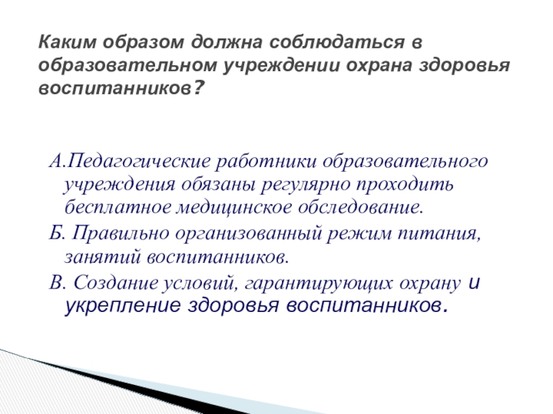 А.Педагогические работники образовательного учреждения обязаны регулярно проходить бесплатное медицинское обследование.