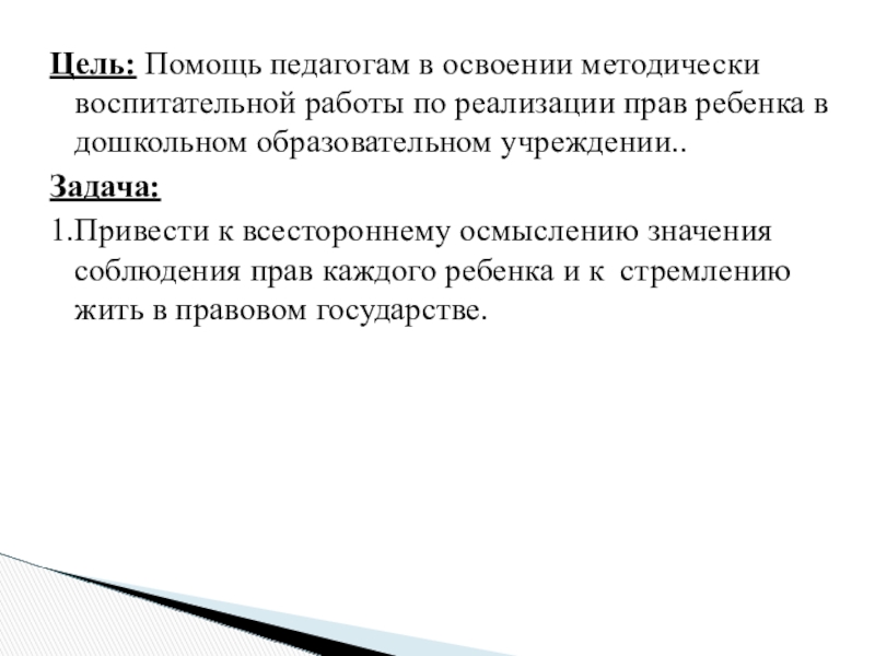 Слайд 2Цель: Помощь педагогам в освоении методически воспитательной работы по реализации прав