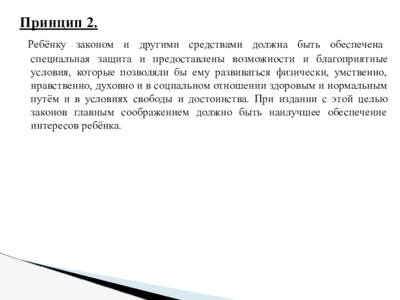 защита и предоставлены возможности и благоприятные условия, которые позволяли бы ему развиваться физически, умственно, нравственно, духовно и в социальном отношении здоровым и нормальным путём и в условиях свободы и достоинства. При издании с этой целью законов главным соображением должно быть наилучшее обеспечение интересов ребёнка.
