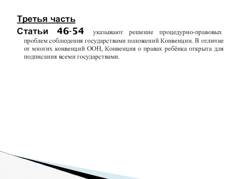 Статьи 46-54 указывают решение процедурно-правовых проблем соблюдения государствами положений Конвенции.